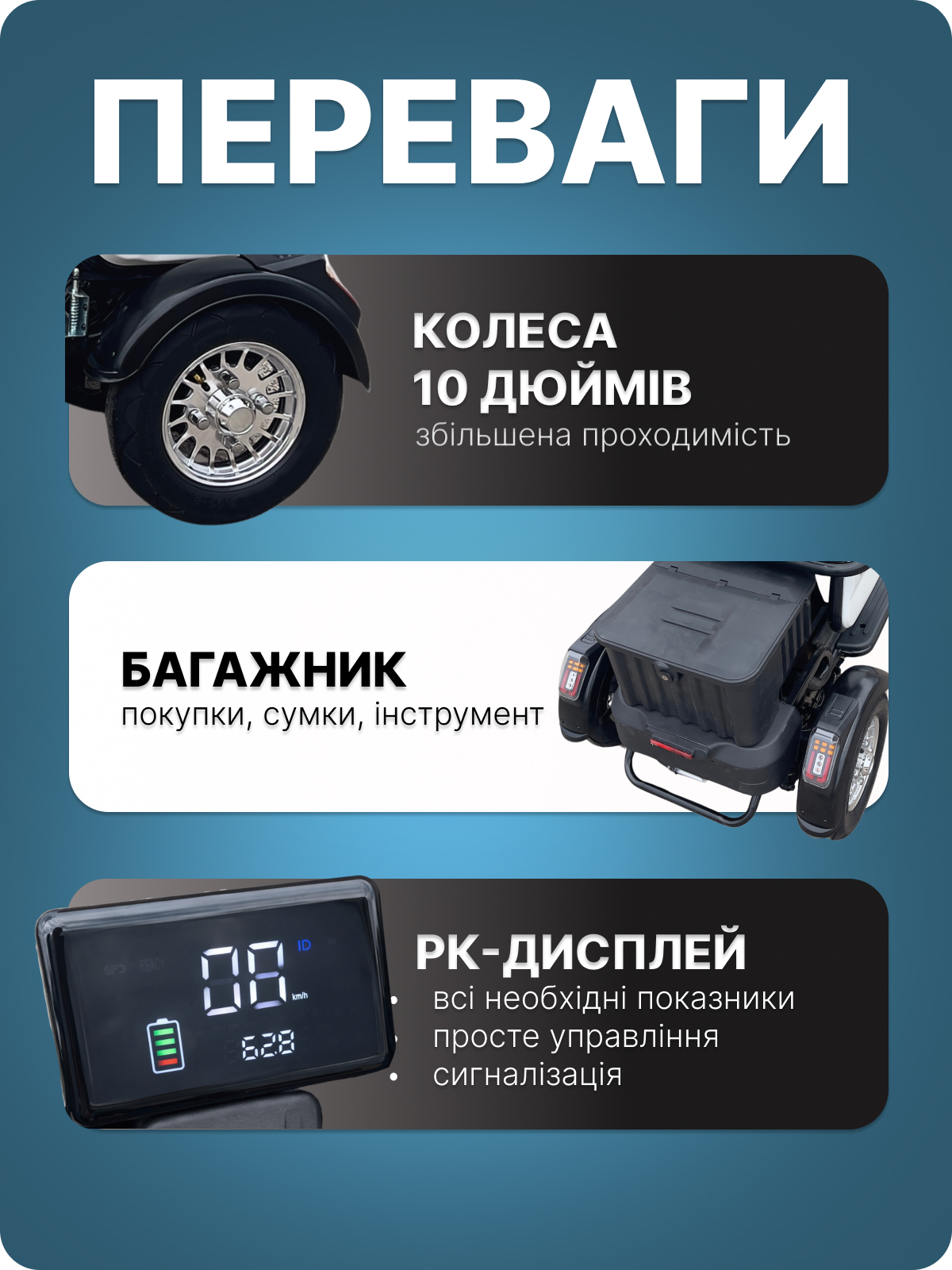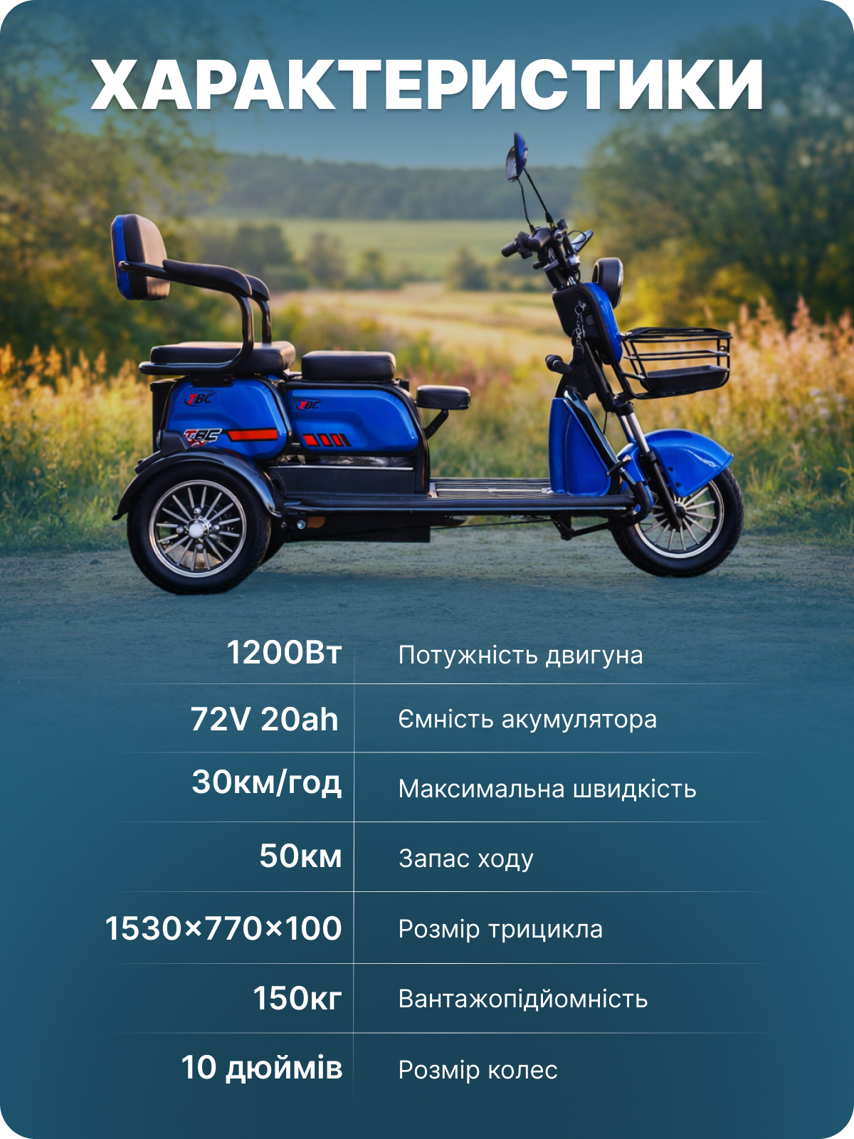 Електротрицикл TBC — це гармонійне поєднання тягової сили та економності. Двигун забезпечує впевнену динаміку навіть при повному завантаженні, а три колеса гарантує стійкість і безпеку під час експлуатації.
